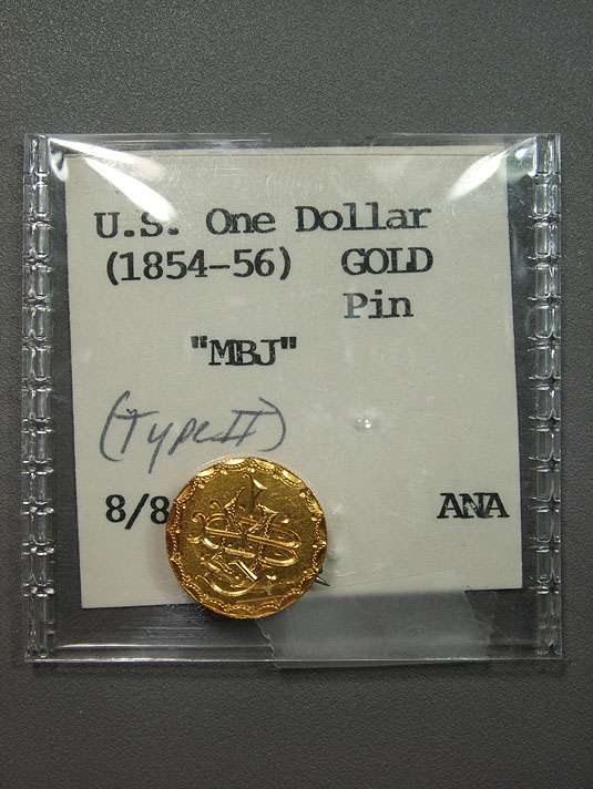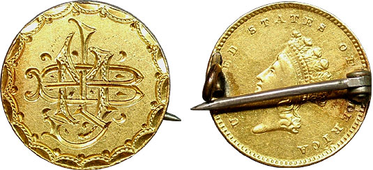 Attractive U.S. Type II Gold Dollar Love Token Engraved - "MBJ" This love token is highly appealing even today. Flashy showing some remnants or original luster in protected areas. She is a gorgeous example of a love token pendant. If you happen to be attached at the hip with a lovely woman with the initials "MBJ" I believe this charm belongs to her...hint, hint.