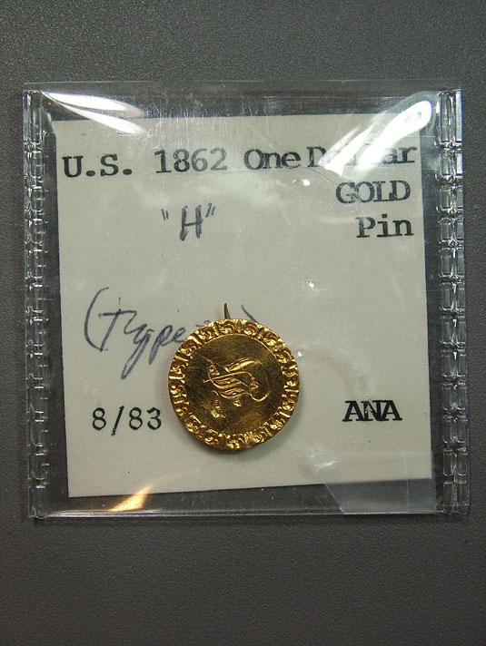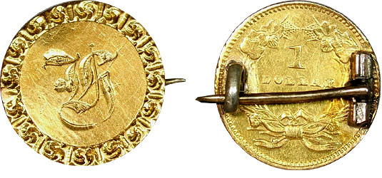 Wow! Behold artistic excellence in this 1862 U.S. Type III Gold Dollar Love Token Pin Engraved - "H" Worn as a pin and having the look and feel of a gold, machine engraved pendant the artist of this unique and appealing love token was quite talented! A perfect gift for the Lady "H" in your life. If such a lady is unbeknownst to you, tell your love it's an art decco lobster and watch as she pinches you in places you'll most appreciate indeed!