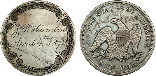 This large Seated Liberty dollar love token is beautifully engraved with ornate borders surrounding “J.P. Hamlin, April 4th 1872” in a romantic script style. It is difficult to locate Seated Dollar love tokens in any condition and this specimen is choice.