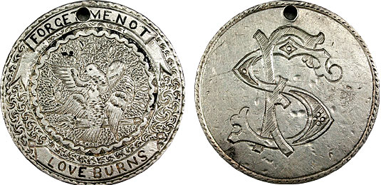 It is beautifully crafted with astoundingly intricate engravings. The two doves embracing is so symbolic of love. Above the doves is the phrase “Forget Me Not”. Below the doves is “Love Burns”. This piece appears to have been made for the owner of a lonely heart unable to be with whom he/she adores. It’s a look deep into the feelings of someone who lived over a hundred years ago. We can see our own feelings being shared by those who came before us and we feel this connection. This piece embodies every reason I enjoy love tokens. The initials FS are on the reverse.