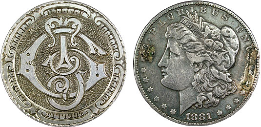 I’m going out on a limb by saying this is GJ. I’m certain about the G but wasn’t 100% positive the other letter is a J. Anyway, this ornate love token exhibits amazing craftsmanship. The money side is very ornate and bordered by an impressive edge design.