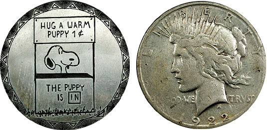1922 $1 US Peace Dollar Love Token – Snoopy Hug a Warm Puppy