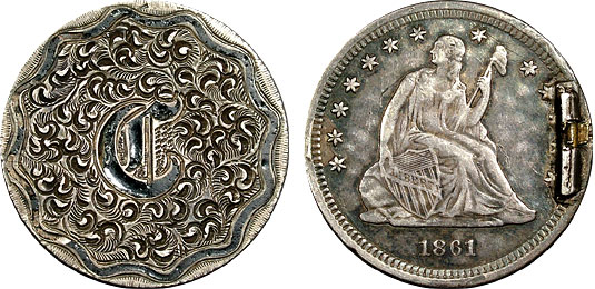 1861 25c US Seated Quarter Love Token Enameled – C