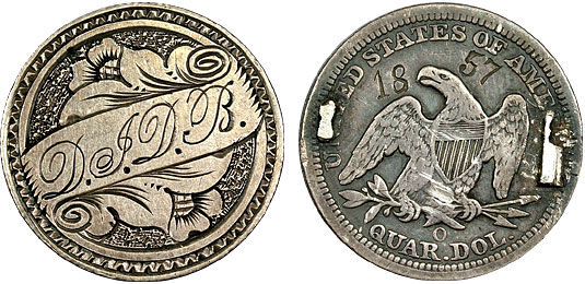I’m just going out on a limb that this coin is an 1857-O Seated Quarter since 1857 is stamped into the back. The money side of this beautiful love token is ornate with flowers and ‘D.J.D.B’ on a scroll. The design is on a textured field and surrounded by a soft border.