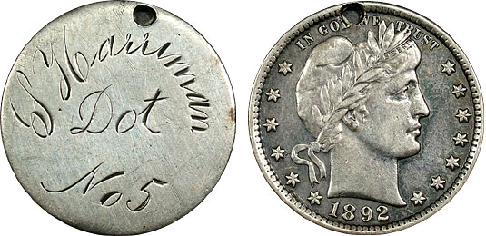 1892 25c US Barber Quarter Love Token – J. Harriman Dot No 5