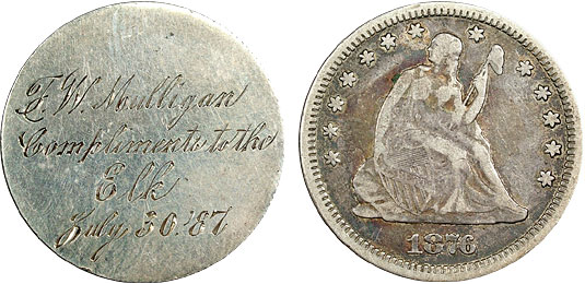 1876 25c US Seated Quarter Love Token – FW Mulligan July 30 ‘87