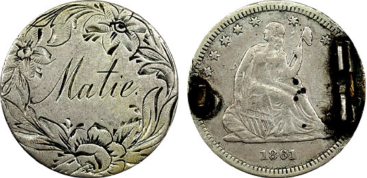1861 25c US Seated Quarter Love Token Flower Pictorial Matie