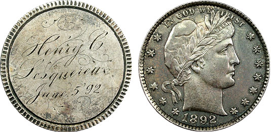 1892 25c US Barber Quarter Love Token Henry C. Lesquereaux?, June 5. 92