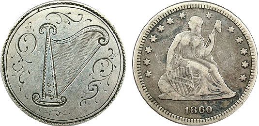 1860 25c US Seated Quarter Love Token Harp Pictorial - Joe
