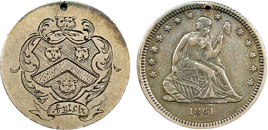 1861 25c US Seated Quarter (Proof?) Love Token – Lion Crest?