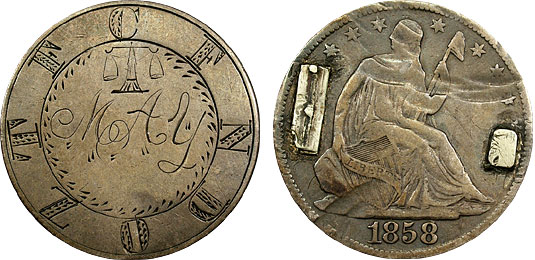 1858 50c US Seated Half Love Token – May w/ Libra C.F.N.D.O.Z.T.F surrounding.