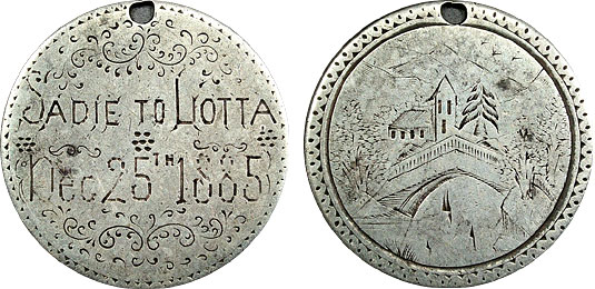 A beautiful and expertly crafted scene of a mountain town and bridge during a winter snow is displayed on one side of this stunning love token. The other side features ‘Sadie to Liotta, Dec 25th, 1885’ accompanied with ornamental engravings.