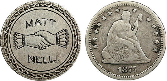 1875 25c US Seated Quarter Friendship Token Pictorial – Matt, Nell, Handshake