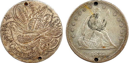 1877 25c US Seated Quarter Love Token Bird Pictorial – Compliments of Julius