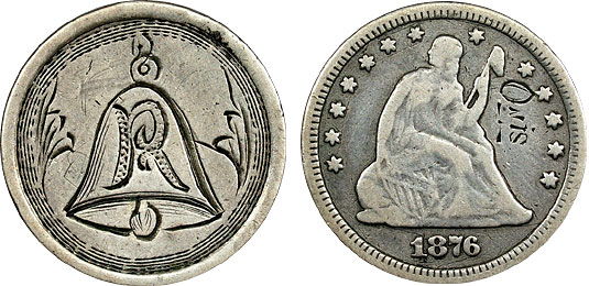 1876 25c US Seated Quarter Love Token – Bell w/ R