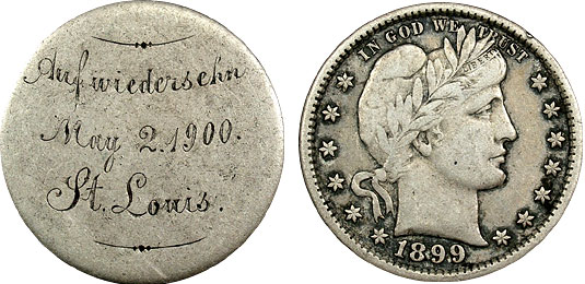1899 25c US Barber Quarter Love Token – Aufwiedersehn St. Louis, 1900