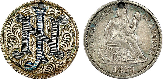 Intricate is an understatement for this stunning love token. The fields are beautifully engraved in a fern pattern surrounding the enameled ‘JN. There is a hole for a chain as well.