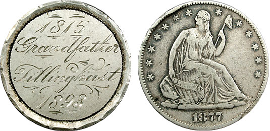 '1815 Grandfather Tillinghast 1893' engraved in script on the moneyside of this 1877 seated liberty. This seems to be a token to remember the life of Grandfather Tillinghast. He was apparently born in 1815 and expired in 1893. He lived a nice, long, 78 years.