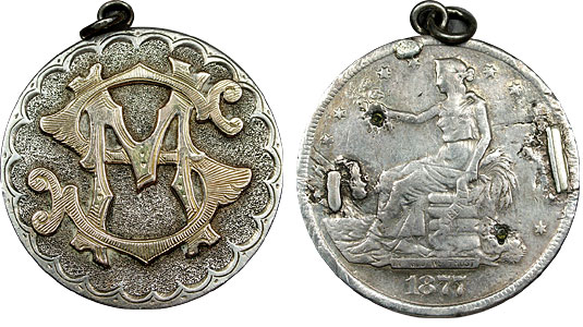 This large and extremely beautiful Trade dollar love token features a large, bold gold overlay of the initials MS and is set atop a heavily textured field and surrounded by a stunning carved border pattern.