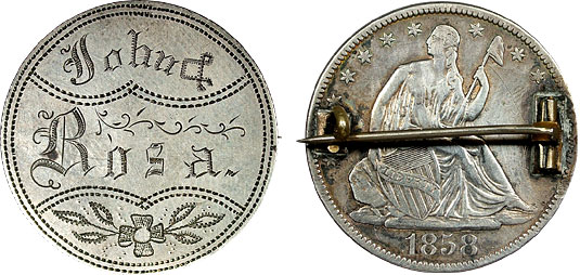 1858 50c US Seated Half Love Token Pin – John & Rosa