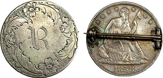 This beautiful Seated Half love token is adorned with an R and surrounded by very appealing floral engravings that serve as the border pattern.