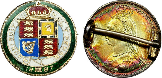 This powerfully enameled love token is beautifully adorned in emerald green, ruby red, white, royal blue, golden yellow, sky blue, and gold in the crest of the Order of the Garter. The back still has the pinback hardware in-tact and this side is beautifully rainbow toned. This stunning token should appeal across collecting interests because of it’s history, it’s exquisite enameling and craftsmanship, and it’s eye-appealing rainbow toning.