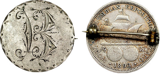 A big, Beautiful, ‘B’ is intricately engraved on the moneyside of this Columbian Commemorative love token pin.