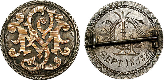 This fantastic gold overlay features an LM on the front and surrounded by an ornate border. On the back, the pinback hardware is still in-tact. The design on the back features LD above Sept 18th. 1883 and surrounded by a beautiful border pattern.