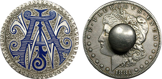 This fantastic pair of large Morgan silver dollar cufflinks are adorned with fabulously intricate engravings of the initials ‘WJA’ and enameled with a deep royal blue. The initials are set on a very intricate field of texture engravings and the design is surrounded by a flashy border. This is an absolutely fabulous pair of cufflinks made for one of our early well-heeled ancestors.