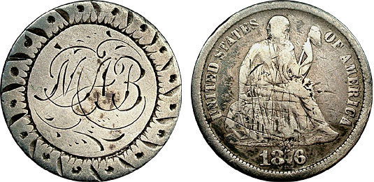 This 1876 Seated Liberty Dime is beautifully engraved with the initials “MAB” and is surrounded by ornamental engravings and an attractive border.