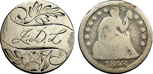 This early Seated Quarter (1848) love token features the initials “L.D.L” on a scroll and accompanied by ornamental floral engravings. You can procure this love token to keep as a constant reminder to watch your cholesterol.