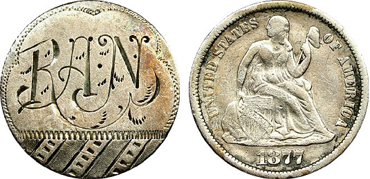 This 1877 Seated Dime love token exhibits the initials “RAN” which is accompanied by ornamental engravings and an attractive edge pattern.