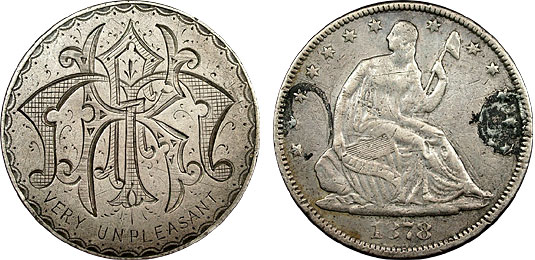 This lovely Seated Half Dollar love token raises more questions about it’s past than many others I’ve cataloged. The initials “HFM” are accompanied with the phrase “VERY UNPLEASENT” beneath the initials.