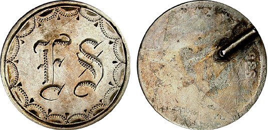 This Capped Bust Dime love token exhibits the initials “FS” set on a smooth field and surrounded by a doily border design.