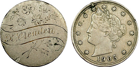 This 1905 Liberty Nickel love token features the name R. Cleaden engraved on a scroll and accompanied by a light floral bouquet engraving.
