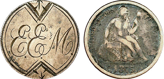 This 1875 Seated Dime is beautifully engraved with the initials “E.E.M.” which is also accompanied by a bold border pattern and accompanying engravings.
