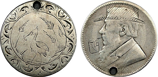 This is a funny and cool love token. On one side is a beautiful display of a heron catching a fish near a riverbank and is surrounded by an elegant border design. On the other side, someone took the initiative to engrave a hobo hat, pipe, and coat onto the fellow on the coin.