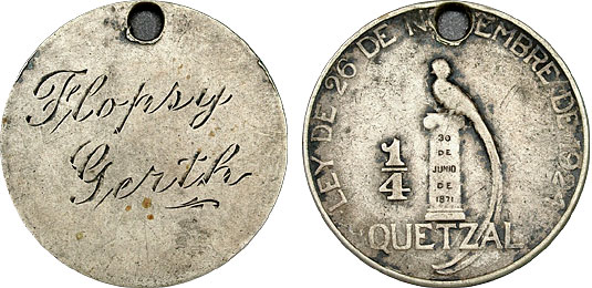 What an interesting name engraved on the moneyside if this fabulous love token. “Flopsy Gerth” is elegantly inscribed and accompanied with an ornamental engraving. The coin is holed for use on a chain or bracelet.