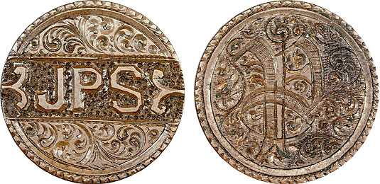 This is the most heavily engraved Copper Cent love token I have handled. On one side is “JPS” in high relief and surrounded by incredibly intricate ornamental engravings. On the other side, the initials “JPS” is set on a massively intricate field.