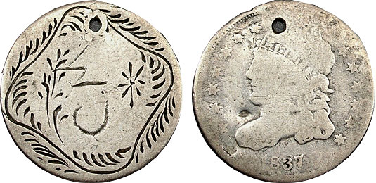 This rare Bust Dime love token is engraved with “C.M.” and surrounded by ornamental engravings.