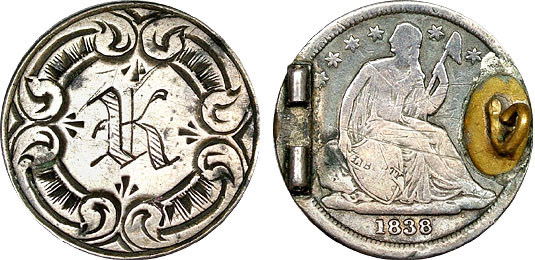 This beautiful first year Seated Quarter is engraved with a bold “K” and surrounded by a powerful border design.
