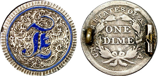 This fantastic Seated Dime love token is intricately engraved and enameled with royal blue on the letter “E”