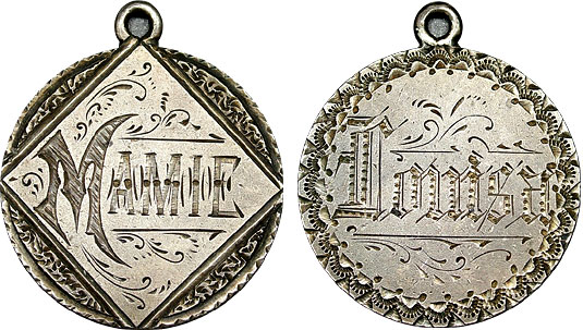 “Mamie” is intricately engraved on the one side and set in a diamond and surrounded by an attractive border pattern. On the other side, “Imusa”? is engraved and accompanied with ornamental engravings and surrounded by a nice border pattern.