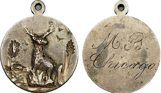 This superbly engraved love token features a deer in high relief on one side and “M.B. Chicago” on the other side. This is quite and amazing love token.