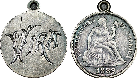 This beautifully engraved Seated Dime features the name “Vira” on the moneyside.