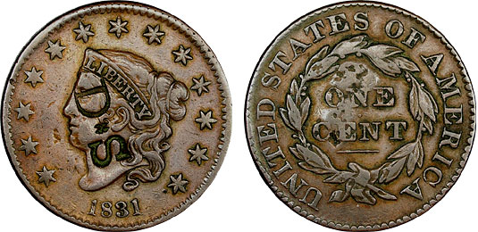 1831 1c US Coronet Large Cent Counterstamped – D.S