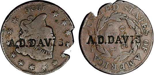 This heavily weathered Matron Head Large Cent is counterstamped on both the obverse and reverse with “A.D. DAVIS”.