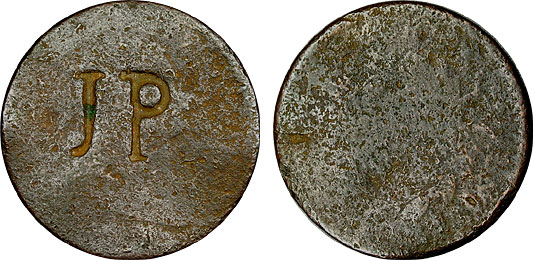 This weathered Draped Bust Large Cent is counterstamped on the obverse “JP”. This appears to be a VERY early counterstamp.