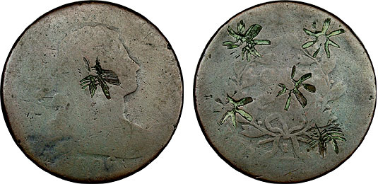 This Draped Bust Large Cent is counterstamped on both the obverse and the reverse multiple times with a Flower design punch tool.
