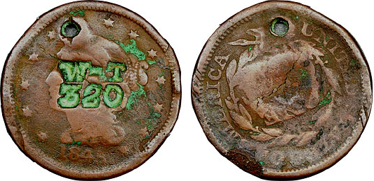 This Coronet Head Cent is quite heavily weathered and has irregular edges from heavy use (most likely not in commerce), and is counterstamped with “W-T; 320” on the obverse.